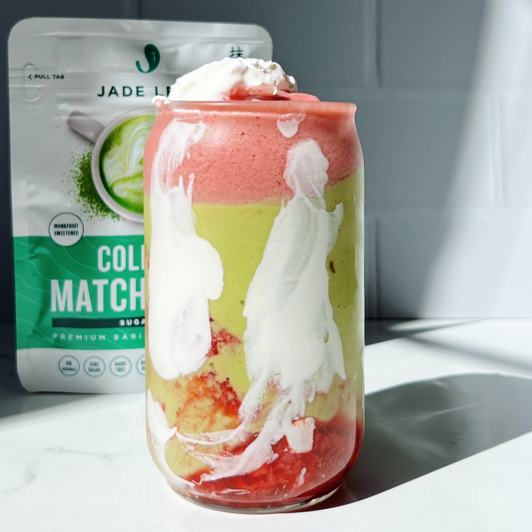 Blend together your strawberry layer ingredients and pour on top of your matcha layer