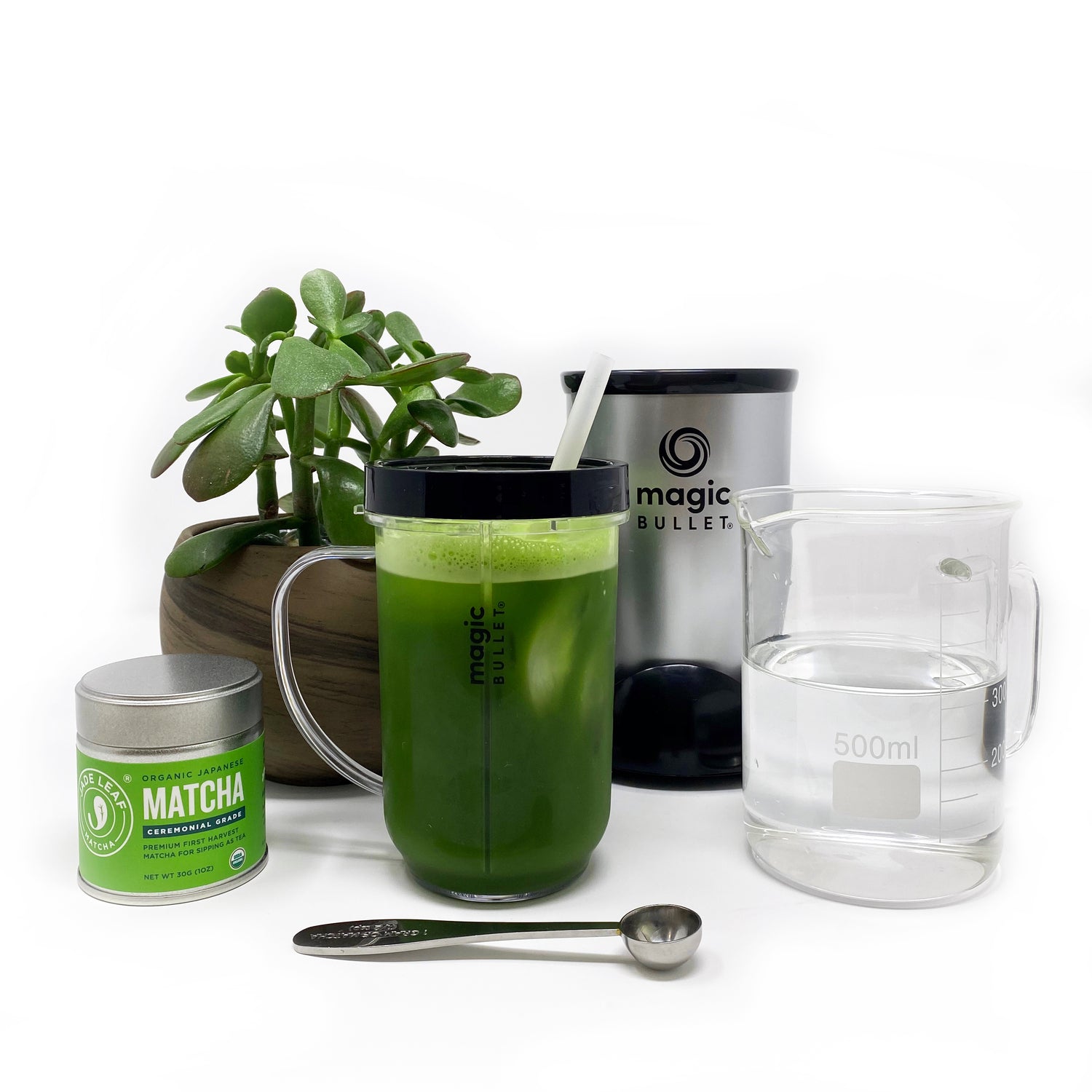 Simply add 8oz of water and 1/2 to 1 tsp of matcha to your bullet, then blend! Add some ice and serve.