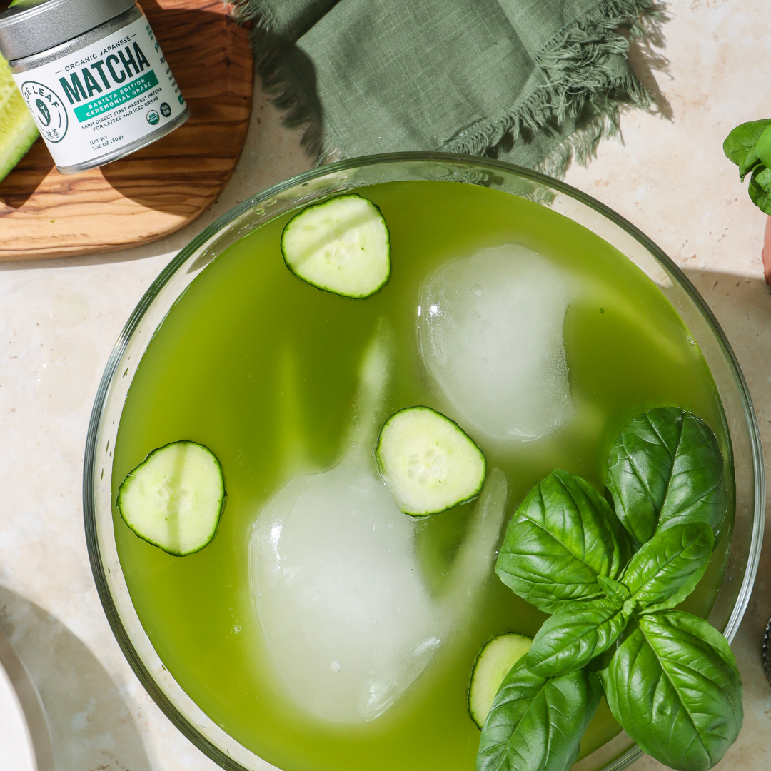 - Make the cocktail: in the bottom of a tall glass or cocktail shaker, muddle basil leaves, 2 of the cucumber slices, honey, and Jade Leaf Barista Edition Ceremonial Matcha until mixture is juicy and cucumber is smashed into small pieces.